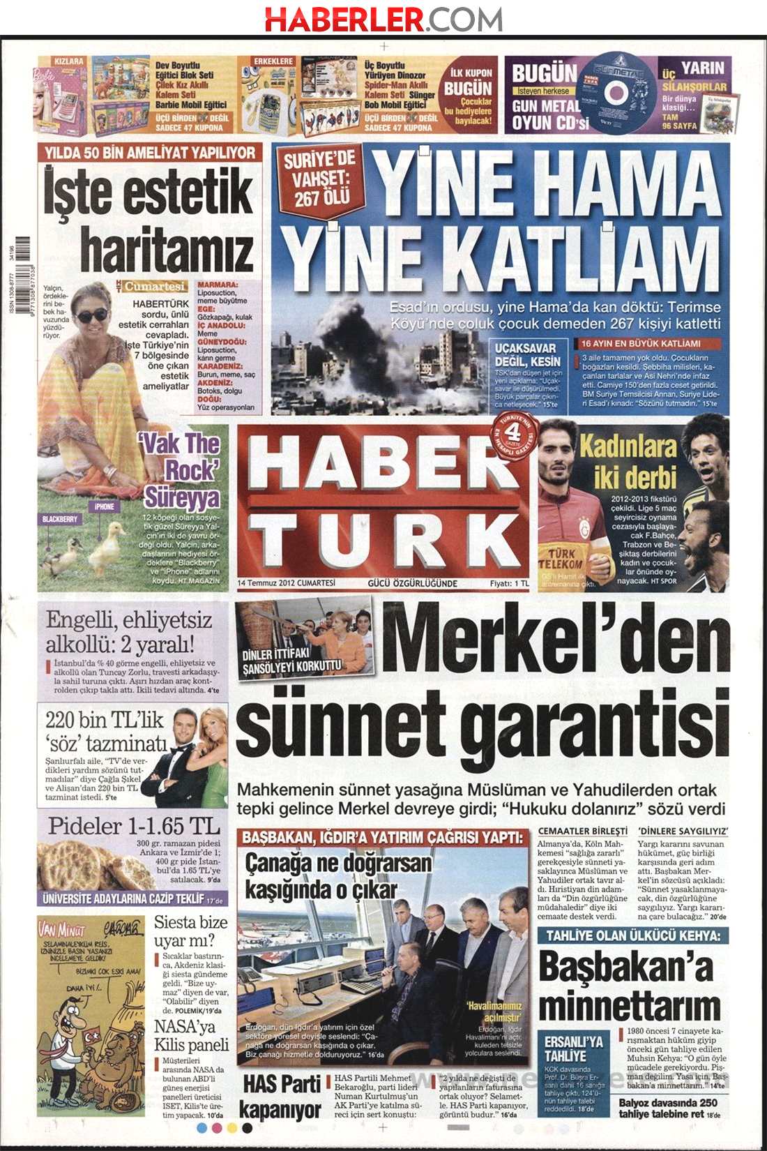 »Εγγύηση Μέρκελ για την περιτομή» είναι ο τίτλος της Haberturk που κάνει αναφορά στο θέμα απαγόρευσης της περιτομής απο δικαστήριο της Κολωνίας. «Μετά απο τις αντιδράσεις των Μλουσουλμάνων και των Εβραίων εκρπόσωπος της γερμανικής κυβέρνησης δήλωσε πως θα βρεθεί λύση στο θέμα καθώς η κυβέρνηση σέβεται όλες τις θρησκείες» γράφει η τουρκική εφημερίδα.