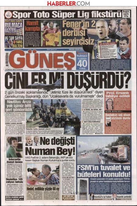 » Το έριξαν τα στοιχειά»; είναι ο τίτλος της Guneş που κάνει αναφορά στο RF-4 και ειρωνεύεται τις ανακοινώσεις των τουρκικών ενόπλων δυνάμεων. «Ο στρατός πριν δυο ημέρες είχε ανακοινώσει πως το αεροσκάφος μας δεν καταρρίφθηκε με πυραύλους, τώρα ανακοίνωσε πως δεν χτυπήθηκε με αντιαεροπορικά πυροβόλα. Τότε τι συνέβη στο αεροσκάφος μας» γράφει η τουρκική εφημερίδα