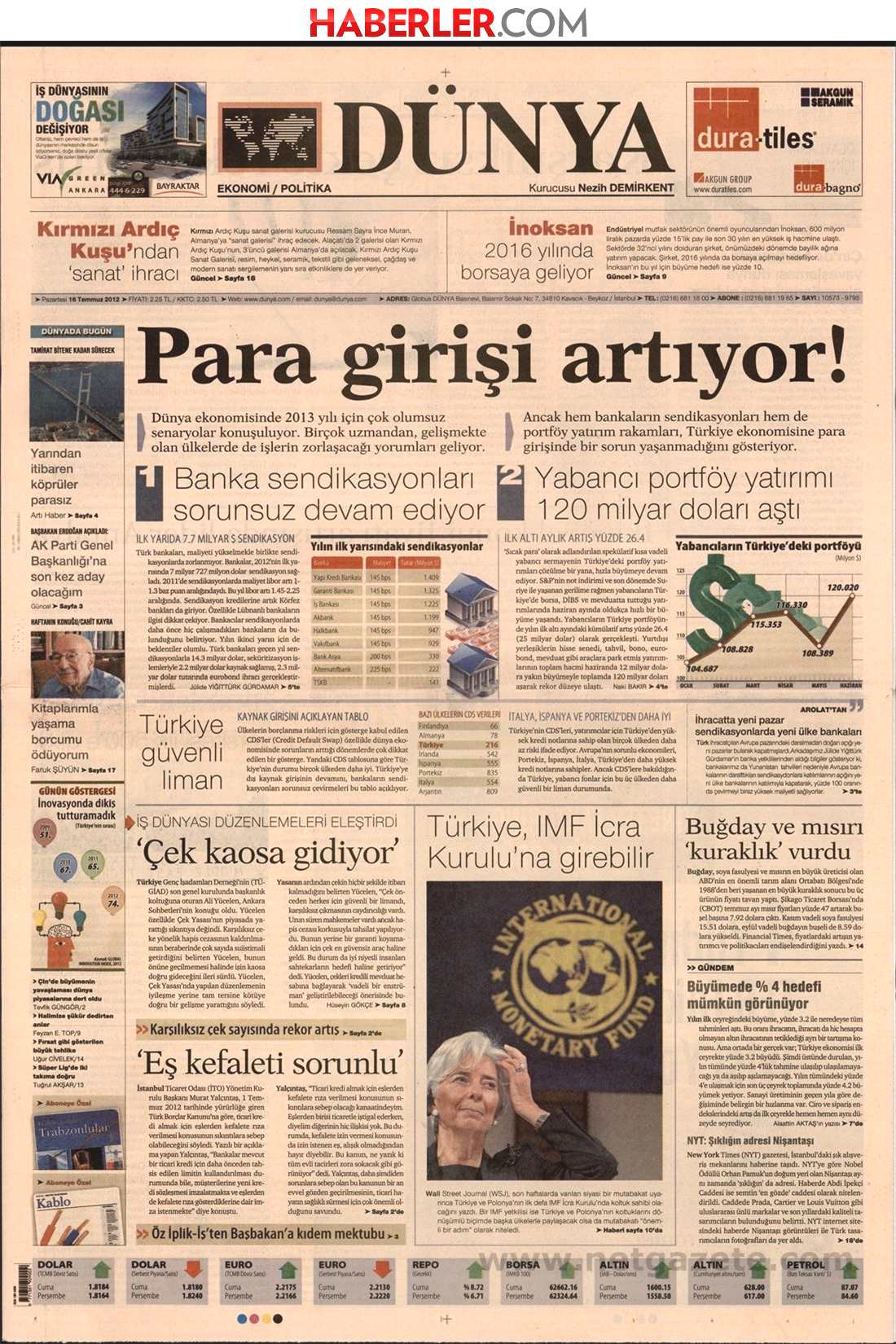 «Αύξηση των ειδροών χρήματος» είναι ο τίτλος της εφημερίδας Dünya η οποία αναφέρει πως παρά την αρνητική παγκόσμια οικονομική κατάσταση , αυξάνονται οι επενδύσεις στα χρηματοπσιτωτικά ιδρύματα της Τουρκίας. Σύμφωνα με την τουρκική εφημερίδα οι εισροές χρήματος για επενδύσεις απο το εξωτερικό αυξήθηκαν ακατα 25.6%.
