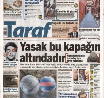 » Η απαγόρευση είναι κάτω απ’ αυτό το καπάκι» είναι ο τίτλος της Taraf που αναφέρει πως μετά απο πιέσεις , επιβλήθηκε απαγόρευση αλκοολούχων ποτών σε ουσικό φεστιβάλ μουσικής πανεπιστημίου που χορηγός ήταν η εταιρεία παραγωγής μπίρας Έφες Πίλσεν. Σύμφωνα με τους πανεπιστημιακούς κύκλους η απαγόρευση έγινε μετά απο εντολές της κυβέρνησης στην Άγκυρα.