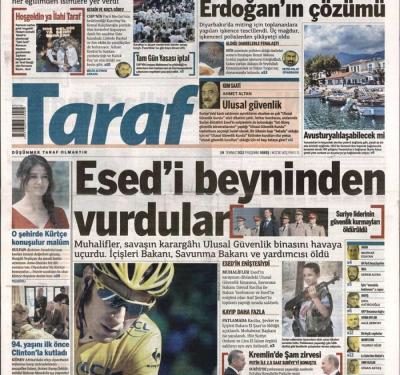 » Χτύπησαν τον Άσαντ στον εγκέφαλο» είναι ο τίτλος της εφημερίδας Taraf. H ίδια εφημερίδα γράφει «η αντιπολίτευση χτύπησε το στρατηγείο των στρατηγών του ΄Ασαντ.Σκοτώθηκαν ο Υπουργός Άμυνας, Εσωτερικών και ο βοηθός τους»