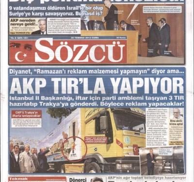 «Η εξωτερική πολιτική κόλλησε» έχει τίτλο η Sözcü και αναφέρει πως οι πολιτικές του Νταβούτογλου παρουσιάζουν σοβαρά προβλήματα. Η τουρκική εφημερίδα αναρωτιέται και γράφει « καταπολεμάμε τη Συρία μαζί με το Ισραήλ το οποίο έχει δολοφονήσει 9 πολίτες μας . Πως συμβαίνει αυτό;»