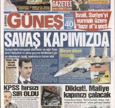 «Ο πόλεμος στην πύλη μας » είναι ο τίτλος της Güneş που αναφέρει πως το Ισραήλ έχει πάρει απόφαση επιχείρησης στη Δαμασκό για να μην περάσουν στα χέρια της Χεζμπιλάχ τα χημικά όπλα και οι πύραυλοι της Συρίας.