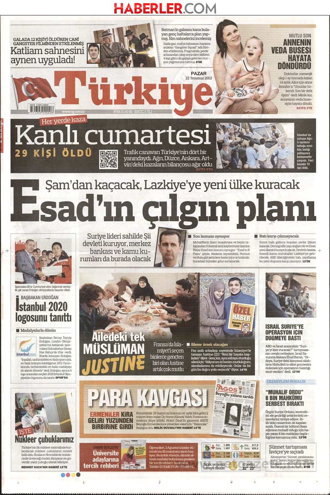 « Το τρελό σχέδιο του Άσαντ» είναι ο τίτλος της Τürkiye. H τουρκική εφημερίδα αναφέρεται σε διάφορα σενάρια που κυκλοφορούν για το μέλον του ηγέτη της Συρίας και ένα απ’αυτά αναφέρει πως ο Άσαντ θα εγκατασταθεί στη Λατάκεια για να ιδρύσει ένα νέο κράτος»