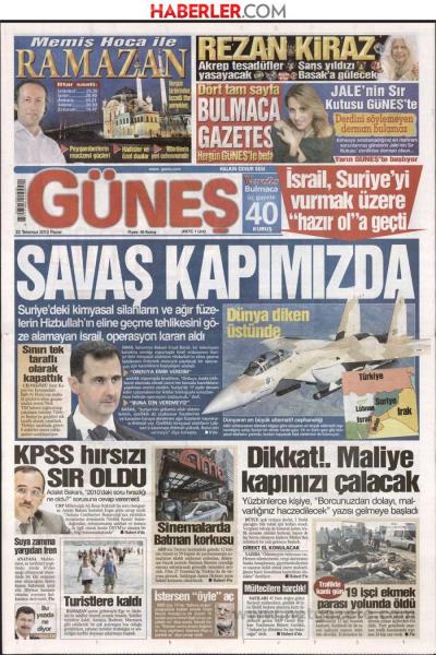 «Ο πόλεμος στην πύλη μας » είναι ο τίτλος της Güneş που αναφέρει πως το Ισραήλ έχει πάρει απόφαση επιχείρησης στη Δαμασκό για να μην περάσουν στα χέρια της Χεζμπιλάχ τα χημικά όπλα και οι πύραυλοι της Συρίας.