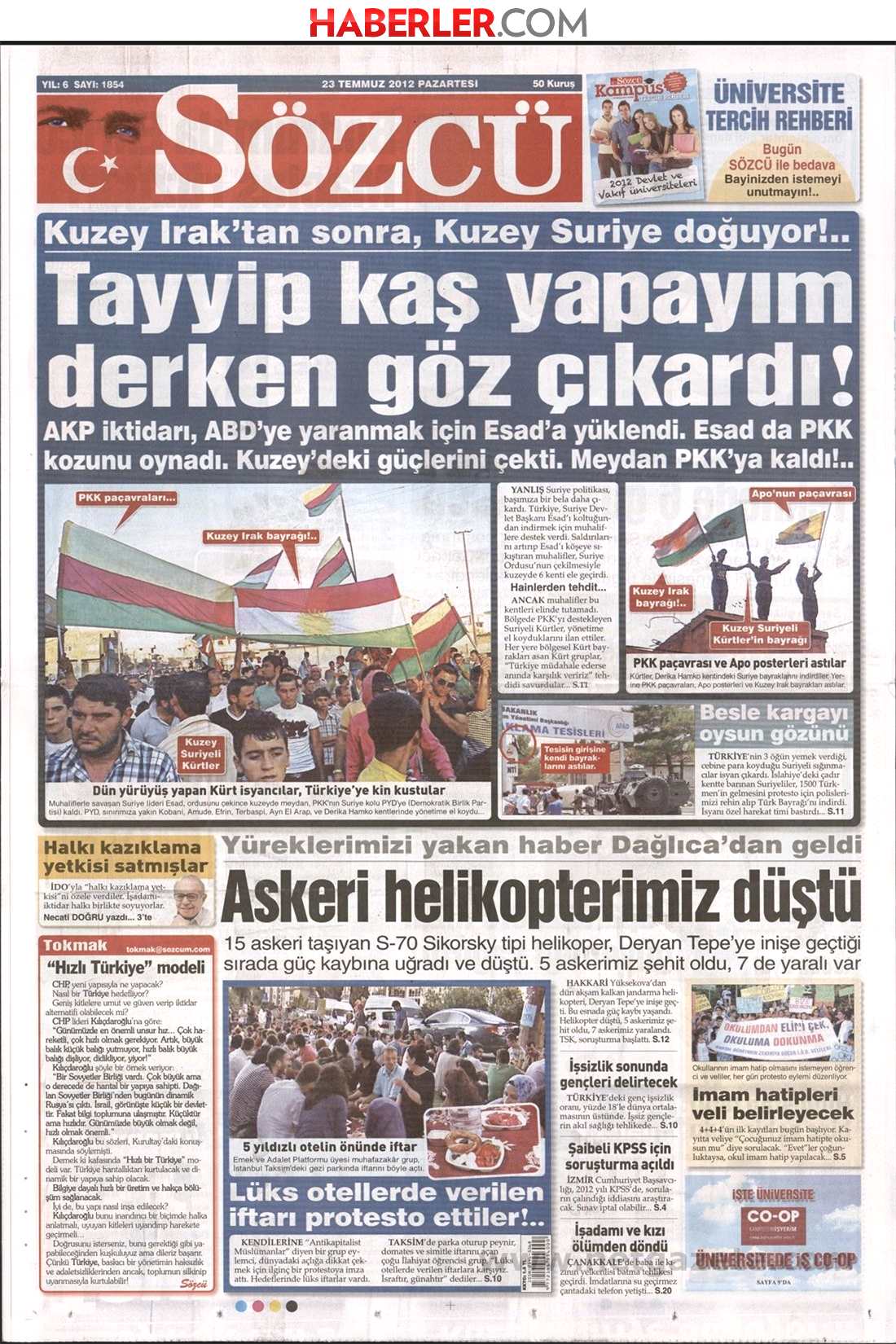 « Ο Ταγίπ πήγε να φτιάξει το φρύδι και έβγαλε το μάτι» είναι ο τίτλος της Sözcü. H τουρκική εφημερίδα υποστηρίζει πως «μετά το Βόρειο Ιράκ δημιουργείται η Βόρεια Συρία. Το κυβερνών κόμμα AKP άκουσε τις εντολές των ΗΠΑ πίεσε τον Άσαντ. Όμως ο Άσαντ έπαιξε το χαρτί του PKK. Aπέσυρε τις δυνάμεις του από το Βορρά και το PKK πήρε τον έλεγχο της περιοχής».