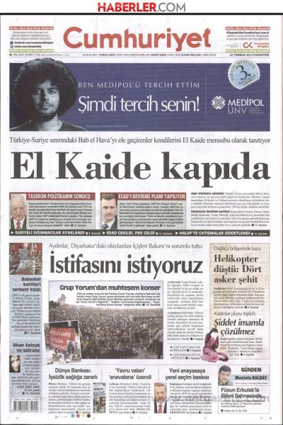 «Η Αλ Κάϊντα είναι στην πύλη μας» είναι ο τίτλος της Cumhuriyet. H τουρκική εφημερίδα αναφέρει πως οι αντιπολιτευόμενοι Στη Συρία οι οποίοι κατέλαβαν το συνοριακό φυλάκιο Μπαμπ Ελ Χάβα, αποκαλούν τον εαυτό τους ως μέλη της Αλ Κάϊντα.