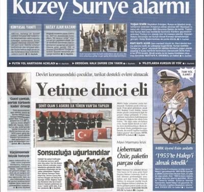 « Η φωτιά στα σύνορα» είναι το τίτλος της Hürriyet. Η εφημερίδα αναφέρει πως σε περιοχές κοντά στα σύνορα, υπάρχουν πια «πόλεις φαντάσματα.» λόγω των βομβαρδισμών. Ο τουρκικό στρατός , σύμφωνα με την εφημερίδα, μεταφέρει δυνάμεις στην περιοχή των συνόρων.