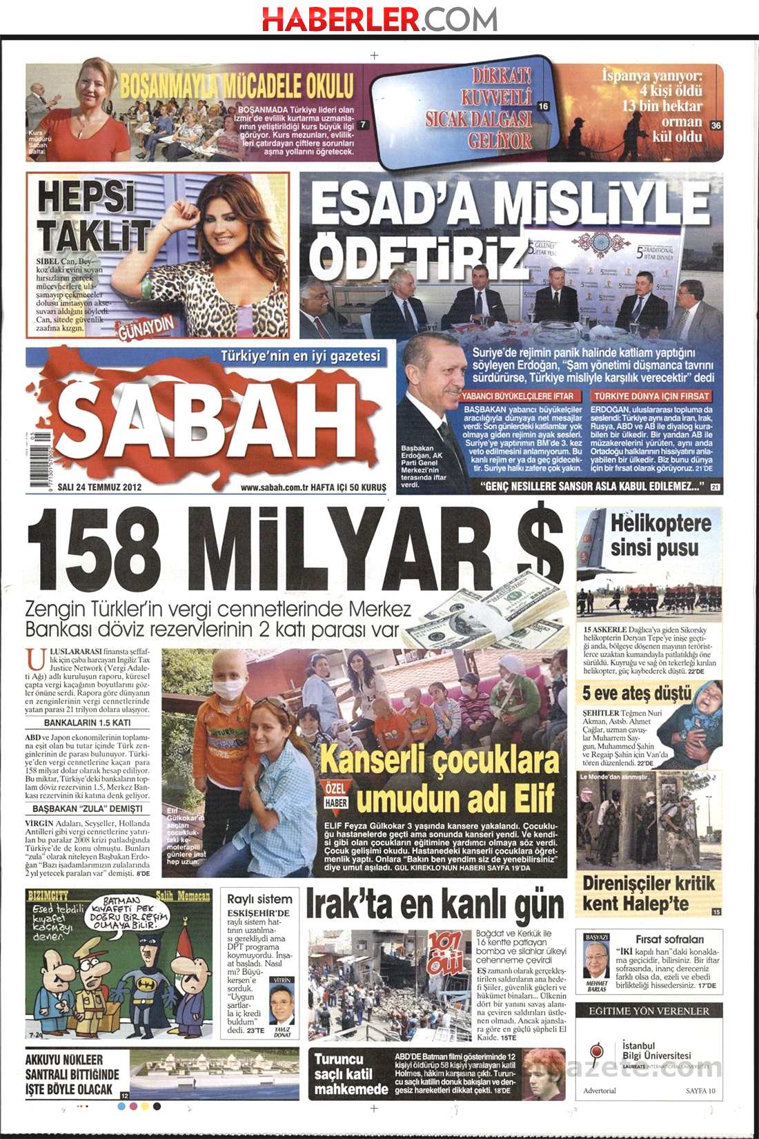 «158 δισεκατομμύρια δολάρια» είναι ο τίτλος της Sabah η οποία αναφέρει πως οι πλούσιοι τούρκοι διαθέτουν πολλά χρήματα στους φορολογικού παραδείσους. Το ποσό αυτό είναι διπλάσιο των αποθεμάτων της Τουρκικής Κεντρικής Τράπεζας.