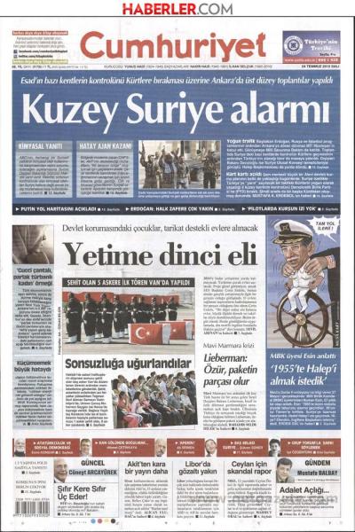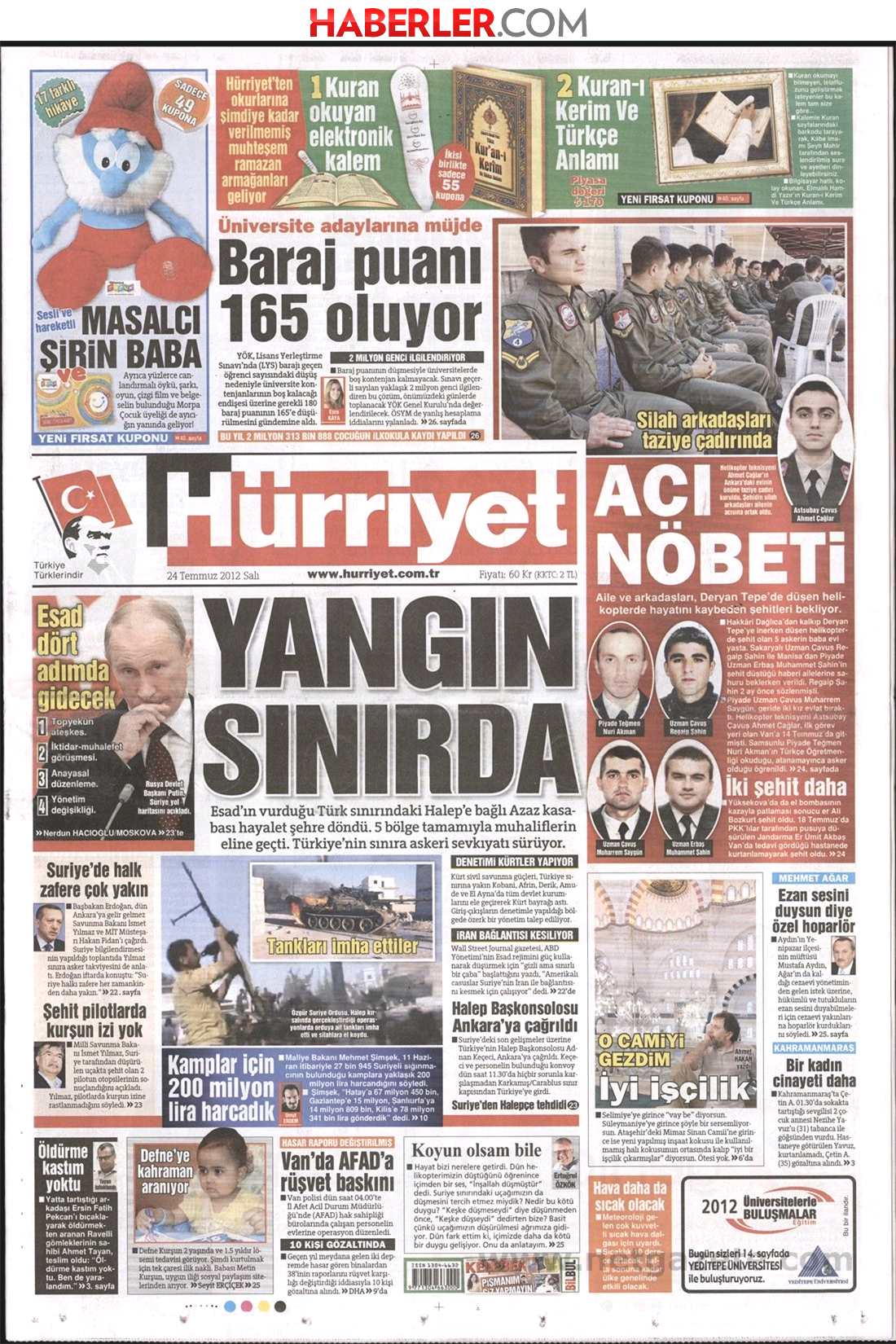 « Η φωτιά στα σύνορα» είναι το τίτλος της Hürriyet. Η εφημερίδα αναφέρει πως σε περιοχές κοντά στα σύνορα, υπάρχουν πια «πόλεις φαντάσματα.» λόγω των βομβαρδισμών. Ο τουρκικό στρατός , σύμφωνα με την εφημερίδα, μεταφέρει δυνάμεις στην περιοχή των συνόρων.
