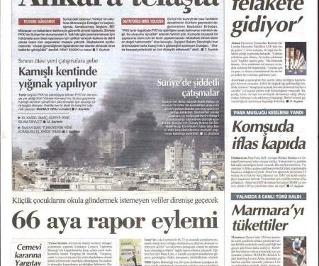 « Η Άγκυρα έχει αγωνία» γράφει η εφημερίδα Cumhuriyet. H τουρκική εφημερίδα γράφει πως « η απρόβλεπτη πολιτική της Άγκυρας έγινε αιτία να εγκατασταθούν στη Βόρεια Συρία η Αλ Κάιντα και η κουρδική οργάνωση PYD.»