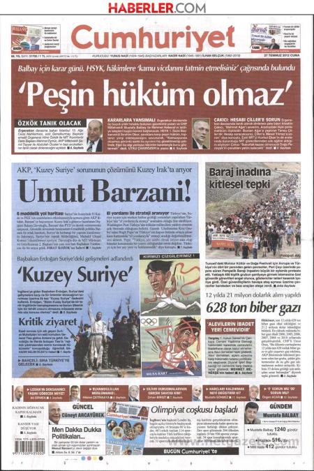 « Η ελπίδα είναι ο Μπαρζανί» είναι ο τίτλος της Cumhuriyet. H τουρκική εφημερίδα αναφέρει πως « το κυβερνών κόμμα Δικαιοσύνης και Ανάπτυξης τη λυση του θέματος της «Βόρειας Συρίας» τη ψάχνει στο «Βόρειο Ιράκ».