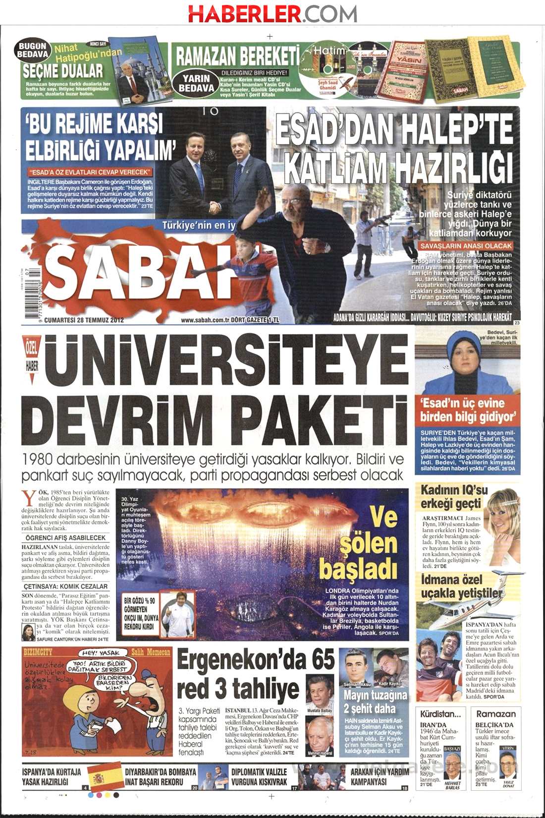 «Επαναστατικό πακετό στα πανεπιστήμια» γράφει η Sabah. H τουρκική εφημερίδα αναφέρει πως με νεο νομοσχέδιο θα αρθούν η απαγορεύσεις του 1980 στα πανεπιστήμια. Δεν θα υπάροχυν απαγορεύσεις σε πανό και αφίσες. Θα επιτρέπεται και πολιτική δραστηριότητα στα πανεπιστήμια.