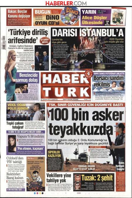 «Σε κατάσταση επιφυλακής 100.000 στρατιώτες» είναι ο τίτλος της Ηaberturk. Η εφημερίδα αναφέρει πως όλη η Β’ Στρατιά τέθηκε σε κατάσταση επιφυλακής για την προστασία των συνόρων με τη Συρία. Η τουρκική εφημερίδα αναφέρει πως ο στρατός ηδη είναι έτοιμος για το ενδεχόμενο χημικού πολέμου.