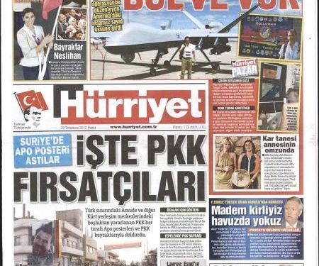 “Oι καιροσκόποι του PKK” είναι ο τίτλος της Hürriyet. H τουρκική εφημερίδα γράφει πώς μέλη του PKK εκμεταλλεύτηκαν το κενό εξουσίας στη Βόρεια Συρία και στην περιοχή Αμούντε αλλά και στα περίχωρα τοποθέτησαν φωτογραφίες και πανό του Οτζαλάν και τοποθέτησαν σημαίες του PKK.