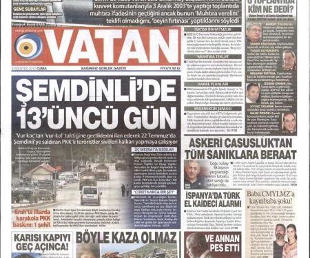 » 13η ημέρα στην πόλη Σεμντίνλι» είναι ο τίτλος της Vatan, η οποία αναφέρεται στις μάχες των ανταρτών του PKK με τον τουρκικό στρατό στη Νοτιοανατολική Τουρκία. Σύμφωνα με την τουρκική εφημερίδα οι μάχες που συνεχίζονται, επι 13 ημέρες δεν έχουν τελειώσει στην πόλη Σεμντίνλι, και τονίζει πως περίπου 100 αντάρτες του PKK έφτασαν απο το Ιράν για να στηρίξουν αυτούς που δίνουν μάχες.