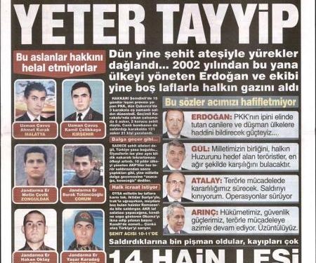 «Ταγίπ! Φτάνει πια. 10 χρόνια το ίδιο παραμύθι» είναι ο τίτλος της Sozcu. H τουρκική εφημερίδα μες αυτόν τον σκληρό τίτλος κάνει αναφορά στην επίθεση του PKK στην ποόλη Χακάρι όπου σκτοτώθηκαν 8 τούρκοι στρατιώτες.» Χθες πάλι είχαμε νεκρούς στρατιώτες. Ο Ερντογάν που κυβερνά αυτή τη χώρα απο το 2002 , πάλι με κενά λόγια προσπαθούν να ηρεμήσουν τονλαό¨γράφει η Sozcu.