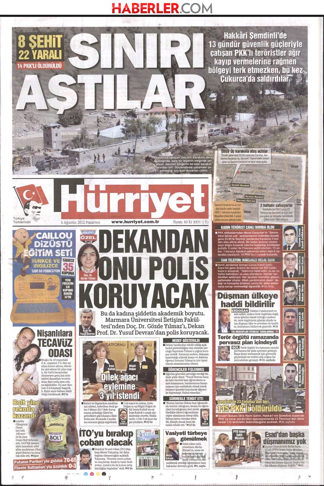 «Πέρασαν τα σύνορα (σ.σ όρια)» είναι ο τίτλος της Hurriyet. «8 νεκροί 22 τραυματίες» γράφει η τουρκική εφημερίδα και συνεχίζει » στην περιοχή Σεμντίνλι οι τρομοκράτες του PKK συγκρούονται επι 13 ημέρες και παρά τις μεγάλες απώλειες τους δεν υποχωρούν. Επιπλέον , επιτέθηκαν στην περιοχή Τσουκούρτζα».