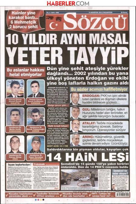 «Ταγίπ! Φτάνει πια. 10 χρόνια το ίδιο παραμύθι» είναι ο τίτλος της Sozcu. H τουρκική εφημερίδα μες αυτόν τον σκληρό τίτλος κάνει αναφορά στην επίθεση του PKK στην ποόλη Χακάρι όπου σκτοτώθηκαν 8 τούρκοι στρατιώτες.» Χθες πάλι είχαμε νεκρούς στρατιώτες. Ο Ερντογάν που κυβερνά αυτή τη χώρα απο το 2002 , πάλι με κενά λόγια προσπαθούν να ηρεμήσουν τονλαό¨γράφει η Sozcu.