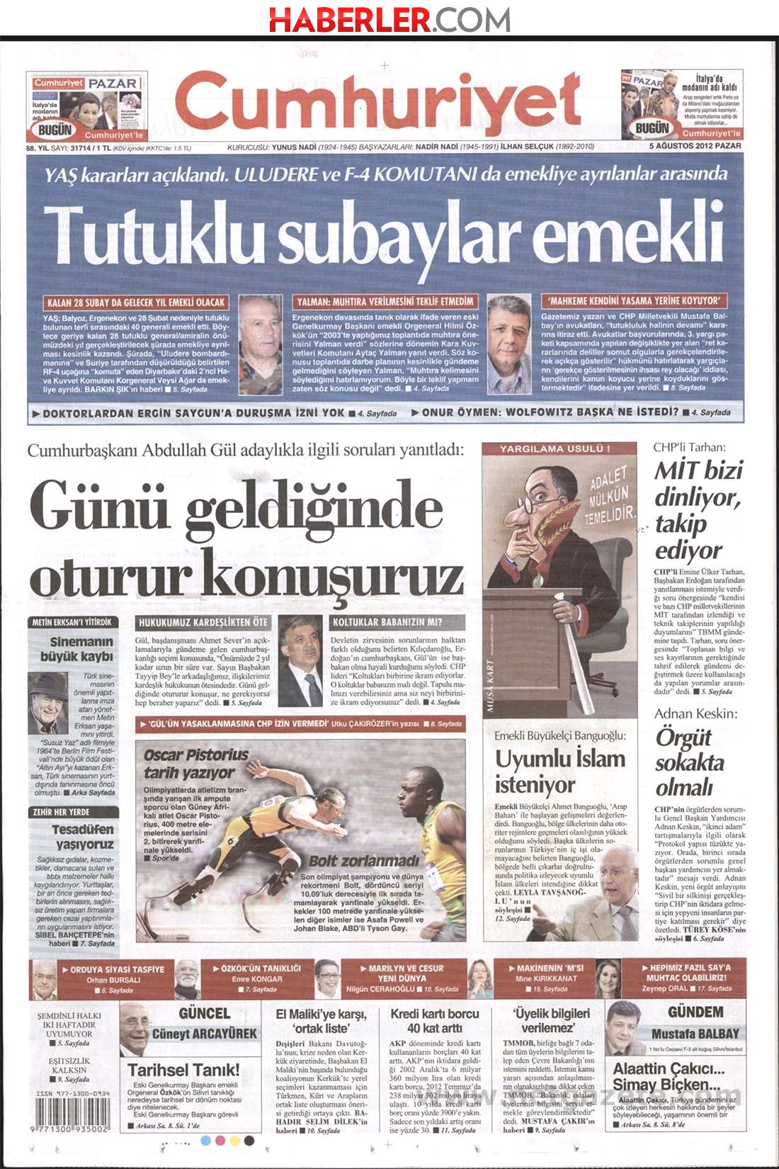 “Oι κρατούμενοι αρχηγοί πήραν σύνταξη» είναι ο τίτλος της Cumhuriyet η οποία κάνει αναφορά στο ίδιο θέμα. Η τουρκική εφημερίδα αναφέρει πως συνταξιοδοτήθηκε και ο αρχηγός της B’ Moίρας της Αεροπορίας στο Ντιγιαρμπακίρ Bεγσί Αγάρ, ο οποίος είχε την ευθύνη και του τουρκικού RF-4 που καταρρίφθηκε από τη Συρία αλλά και τον βομβαρδισμό 34 Κούρδων αμάχων τον Δεκέμβριο του 2011.