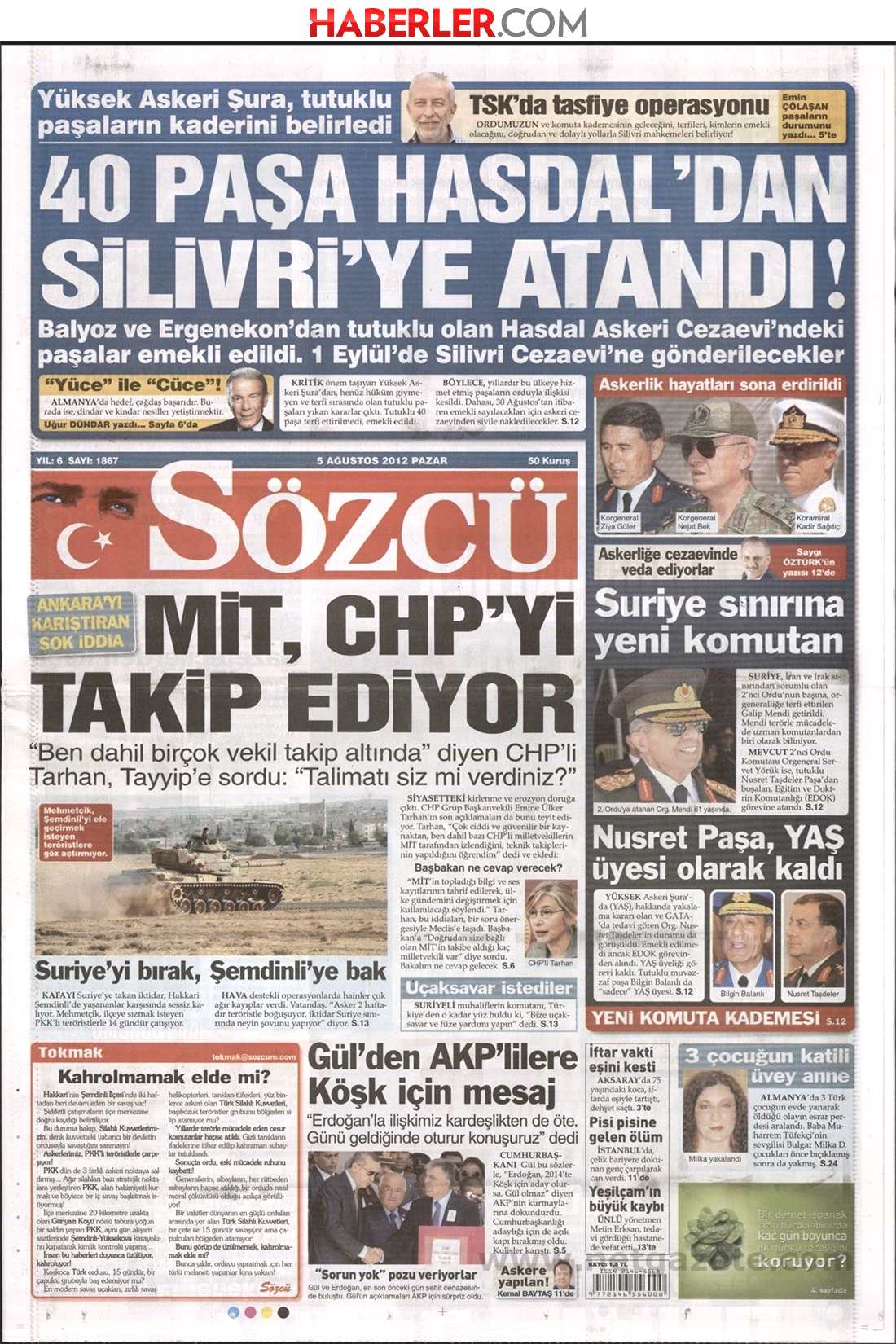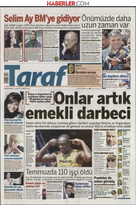 «Εκείνοι πια είναι συνταξιούχοι πραξικοπηματίες» είναι ο τίτλος της Taraf η οποία κάνει αναφορά στο θέμα της συνταξιοδότησης των 40 στρατηγών και ναυάρχων που κατηγορούνταν για συμμετοχή στο σχέδιο «Βαριοπούλα» και στην οργάνωση Εργκενεκόν. Η τουρκική εφημερίδα αναφέρει πως στόχος ήταν η συνταξιοδότηση 23 στρατηγών και ναυάρχων , «όμως ο τούρκος πρόεδρος Αμντουλάχ Γκιούλ επέμεινε και συνταξιοδοτήθηκαν όλοι οι κατηγορούμενοι» γράφει η Taraf.
