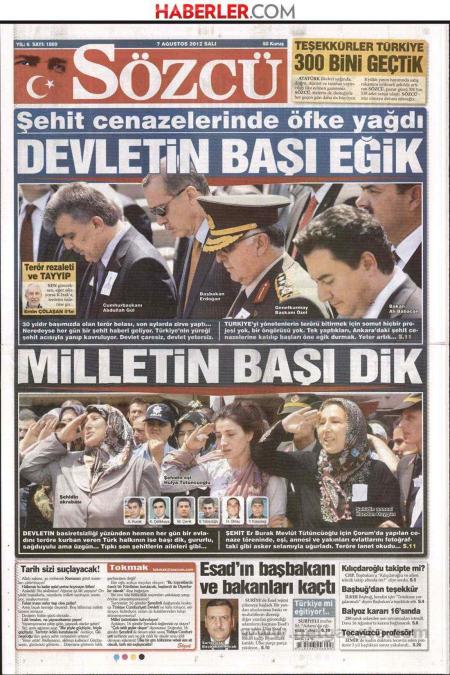 « Το κράτος έχει το κεφάλι του σκυμμένο, o λαός έχει το κεφάλι όρθιο!» είναι ο τίτλος της εφημερίδας Sözcü. Η τουρκική εφημερίδα κάνει αναφορά στις κηδείες των νεκρών στρατιωτών στις οποίες σκοτώθηκαν 8 τούρκοι στρατιώτες. Η εφημερίδα γράφει « Ταγίπ αν έχει θάρρος να εισβάλλεις στο Βόρειο Ιράκ όπου έχει τις βάσεις του το PKK».