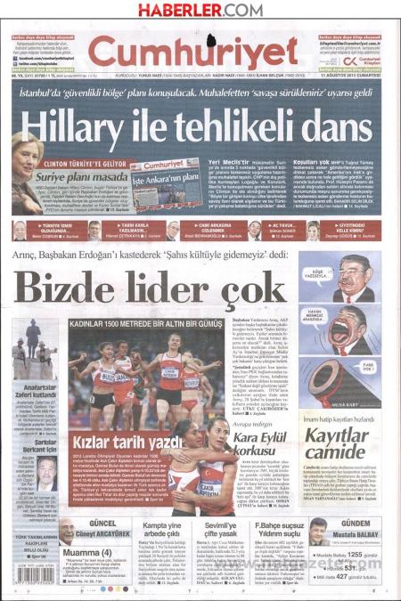 « Επικίνδυνος χορός με τη Χίλαρι» είναι ο τίτλος της Cumhuriyet. H τουρκική εφημερίδα κάνει αναφορά στην επικείμενη επίσκεψη της αμερικανίδας Υπουργού Εξωτερικών Χίλαρι Κλίντον στην Κων/πολη. « Η Τουρκία θα συζητήσει μαζί της την ζώνη ασφαλείας στη Συρία. Όμως η αντιπολίτευση υποστηρίζει πως θα οδηγηθούμε σε πόλεμο».
