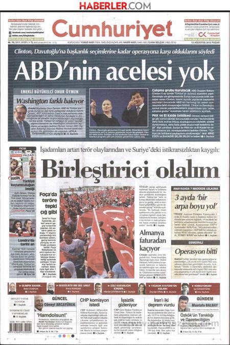 «Οι ΗΠΑ δεν έχουν βιασύνη» είναι ο τίτλος της Cumhuriyet. H τουρκική εφημερίδα αναφέρει στα αποτελέσματα της επίσκεψης της Χίλαρι Κλίντον στην Τουρκία και γράφει πως η αμερικανίδα υπουργός Εξωτερικών ανέφερε πως η χώρα της δεν επιθυμεί καμία επέμβαση στη Συρία μέχρι τις προεδρικές εκλογές στις ΗΠΑ.