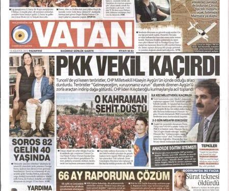 « Το PKK κρατά όμηρο βουλευτή» είναι ο τίτλος της Vatan. Σύμφωνα με την τουρκική εφημερίδα ο βουλευτής του Ρεπουμπλικανικού Λαϊκού Κόμματος Χουσείν Αγκιούν έπεσε στα χέρια του PKK . Koύρδοι αντάρτες , σύμφωνα με την εφημερίδα, έκλεισαν το δρόμο, απείλησαν τον βουλευτή πως θα τον σκοτώσουν επιτόπου και τον πήραν μαζί τους.
