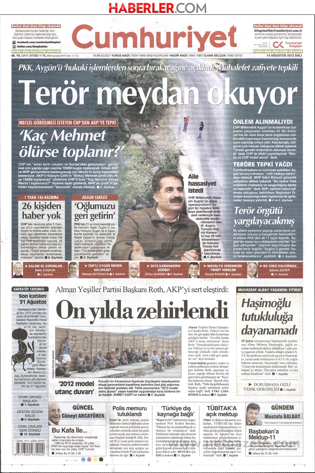 «Η τρομοκρατία απειλεί» είναι ο τίτλος της Cumhuriyet η οποία αναφέρει πως το PKK που απήγαγε τον βουλευτή με προκλητικό τρόπο ανακοίνωσε πως θα τον απελευθερώσει « μετά από τις νόμιμες διαδικασίες». Η τουρκική εφημερίδα αναφέρει πως η αντιπολίτευση αντιδρά και υποστηρίζει πως υπάρχει αδυναμία της κυβέρνησης.