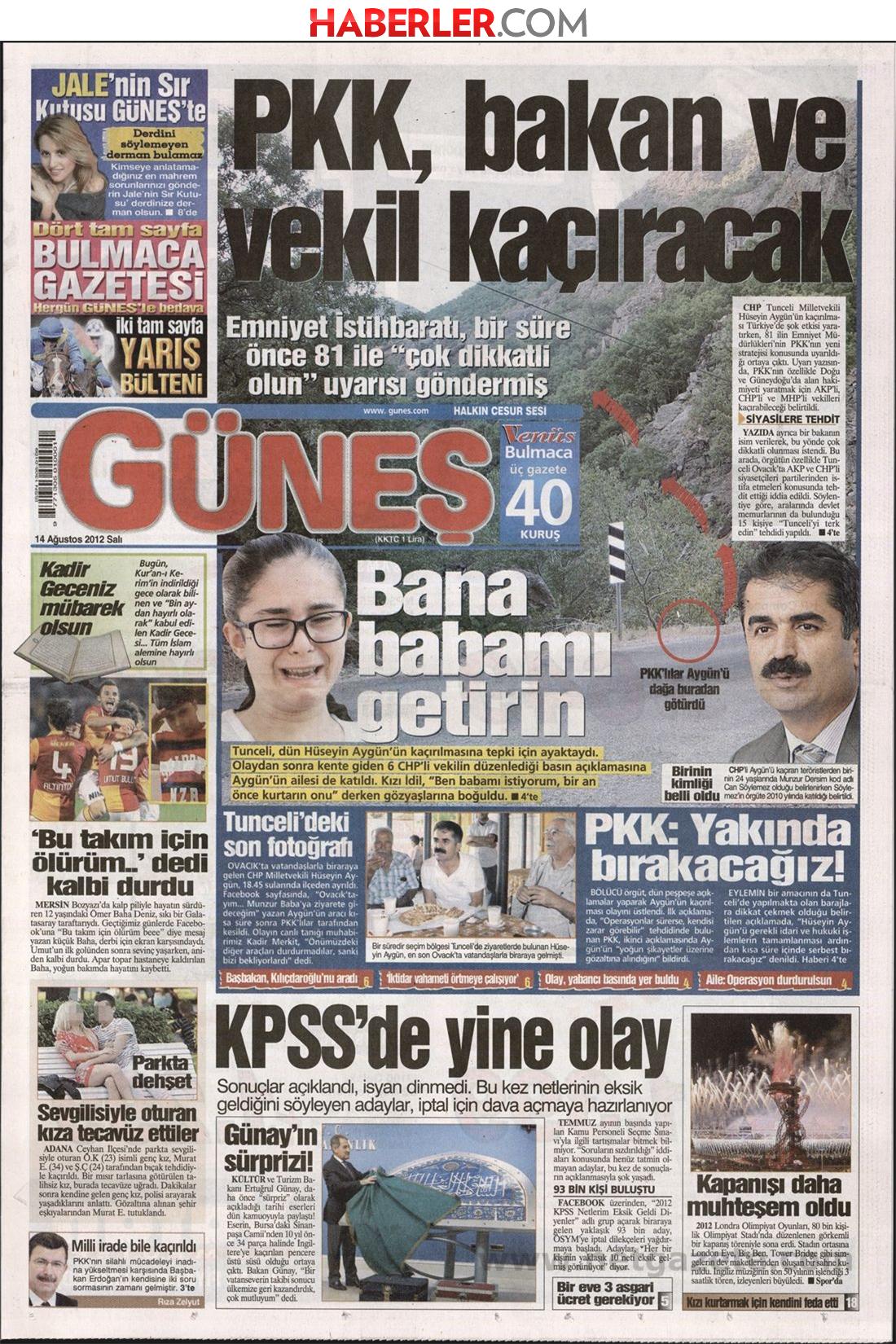 «Το PKK θα απαγάγει βουλευτή και υπουργό» είναι ο τίτλος της Güneş. H τουρκική εφημερίδα αναφέρει πως οι μυστικές υπηρεσίες της Τουρκίας, «ΜΙΤ» είχαν ενημερώσει τις δυνάμεις ασφαλείας 81 πόλεων ,πως το PKK ετοιμάζεται να κάνει κάποια απαγωγή βουλευτή ή υπουργού.