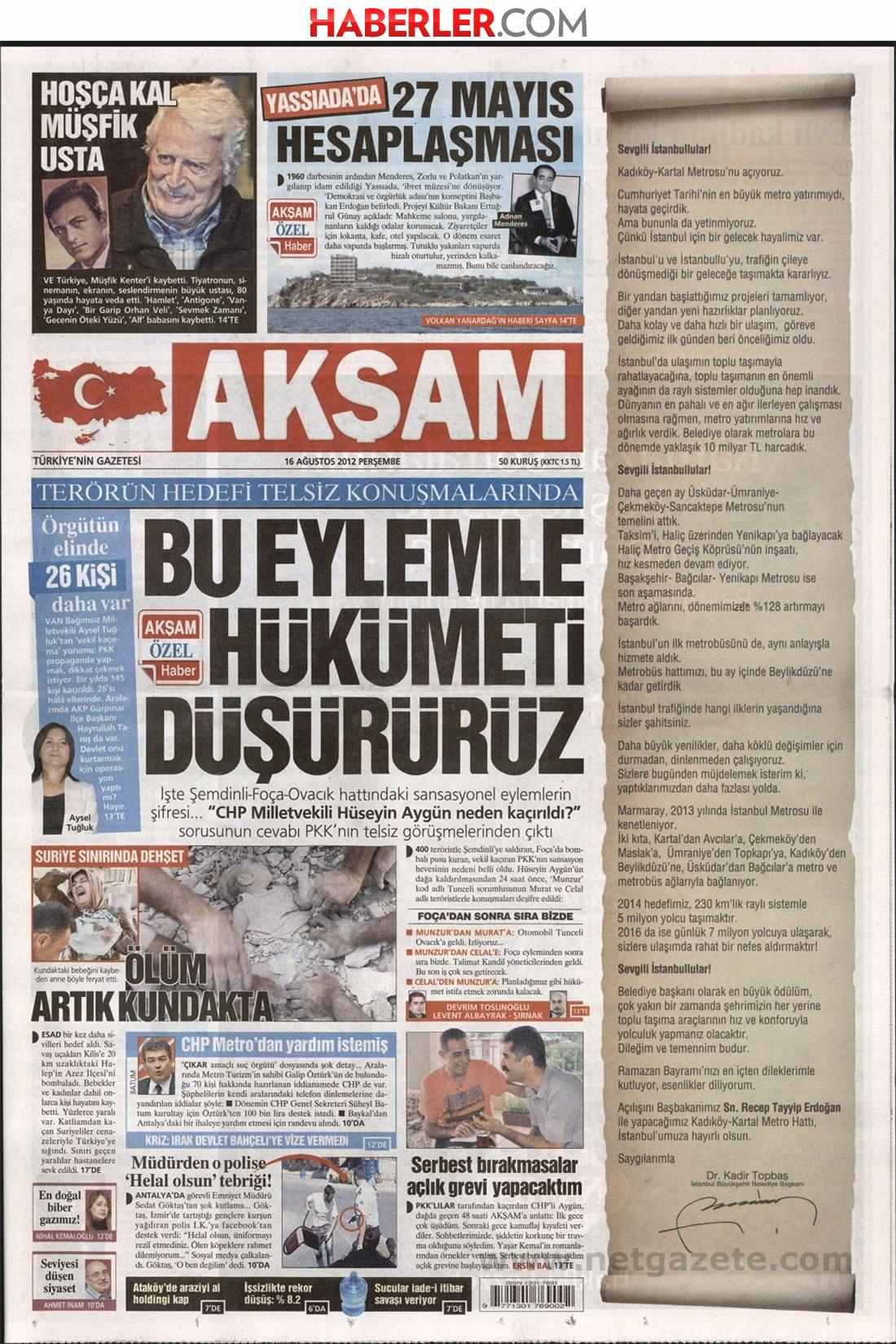 «Με την επίθεση αυτή μπορούμε να ρίξουμε την κυβέρνηση» είναι ο τίτλος της Akşam. H τουρκική εφημερίδα γράφει πως ηχητικά ντοκουμέντα από τις συνομιλίες σε ασύρματο του PKK δείχνουν πως η Κουρδική οργάνωση με τις μεγάλες επιθέσεις και την απαγωγή του τούρκου βουλευτή είχει σαν στόχο να ρίξει την κυβέρνηση.