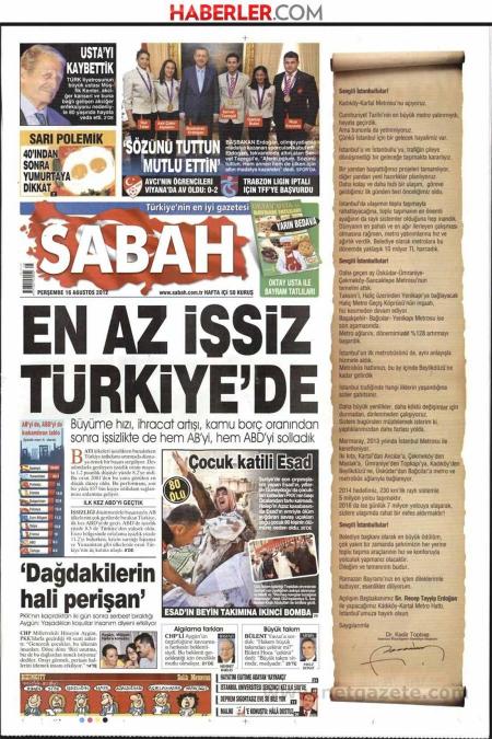 « Οι λιγότεροι άνεργοι είναι στην Τουρκία» είναι ο τίτλος της Sabah. H τουρκική εφημερίδα αναφέρει πως το ποσοστό ανεργίας 8.2% είναι το χαμηλότερο σχετικά με τις ΗΠΑ και τις χώρες της Ε.Ε. « Μετά το ρυθμό ανάπτυξης, το ποσοστό χρέους τώρα προσπεράσαμε την Ε.Ε και τις ΗΠΑ και στο ποσοστό ανεργίας» γράφει η Sabah.
