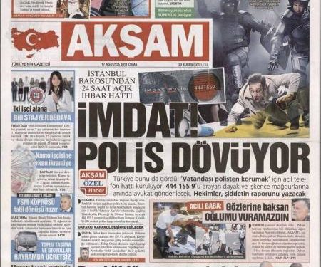 «Βοήθεια με χτυπάει η αστυνομία» είναι ο τίτλος της Akşam. H τουρκική εφημερίδα αναφέρει πως ο δικηγορικός σύλλογος της Κωνστταντινούπολης εγκαινίασε μια νεα τηλεφωνική γραμμή όπου τα θύματα της βίας των αστυνομικών θα μπορούν να καλούν, και να ζητούν άμεση βοήθεια από τους δικηγόρους.