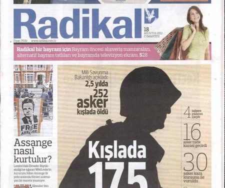 «175 αυτοκτονίες στο στρατόπεδο » είναι ο τίτλος της Radikal. H τουρκική εφημερίδα αναφέρει πως τα τελευταία 2.5 χρόνια 175 στρατιώτες αυτοκτόνησαν. Τα στοιχεία είναι του Υπουργείου άμυνας και σύμφωνα με την εφημερίδα τα τελευταία δέκα χρόνια 934 τούρκοι στρατιώτες έδωσαν τέλος στη ζωή τους.