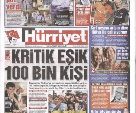 « Το όριο των 100.000» είναι ο τίτλος της Hürriyet. Η τουρκική εφημερίδα φιλοξενεί δηλώσεις του υπουργού εξωτερικών της Τουρκίας Νταβούτογλου ο οποίος «έδωσε τα σημάδια δημιουργίας ζώνης ασφαλείας εντός της Συρίας σε περίπτωση που ο αριθμός των προσφύγων από τη Συρία φτάσει τους 100.000» γράφει η τουρκική εφημερίδα.