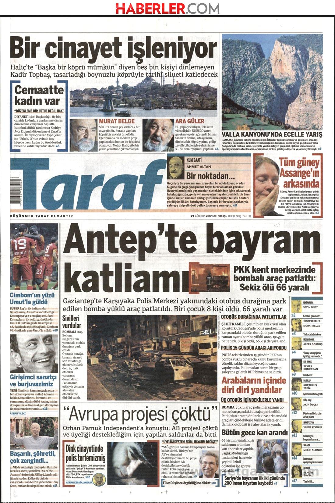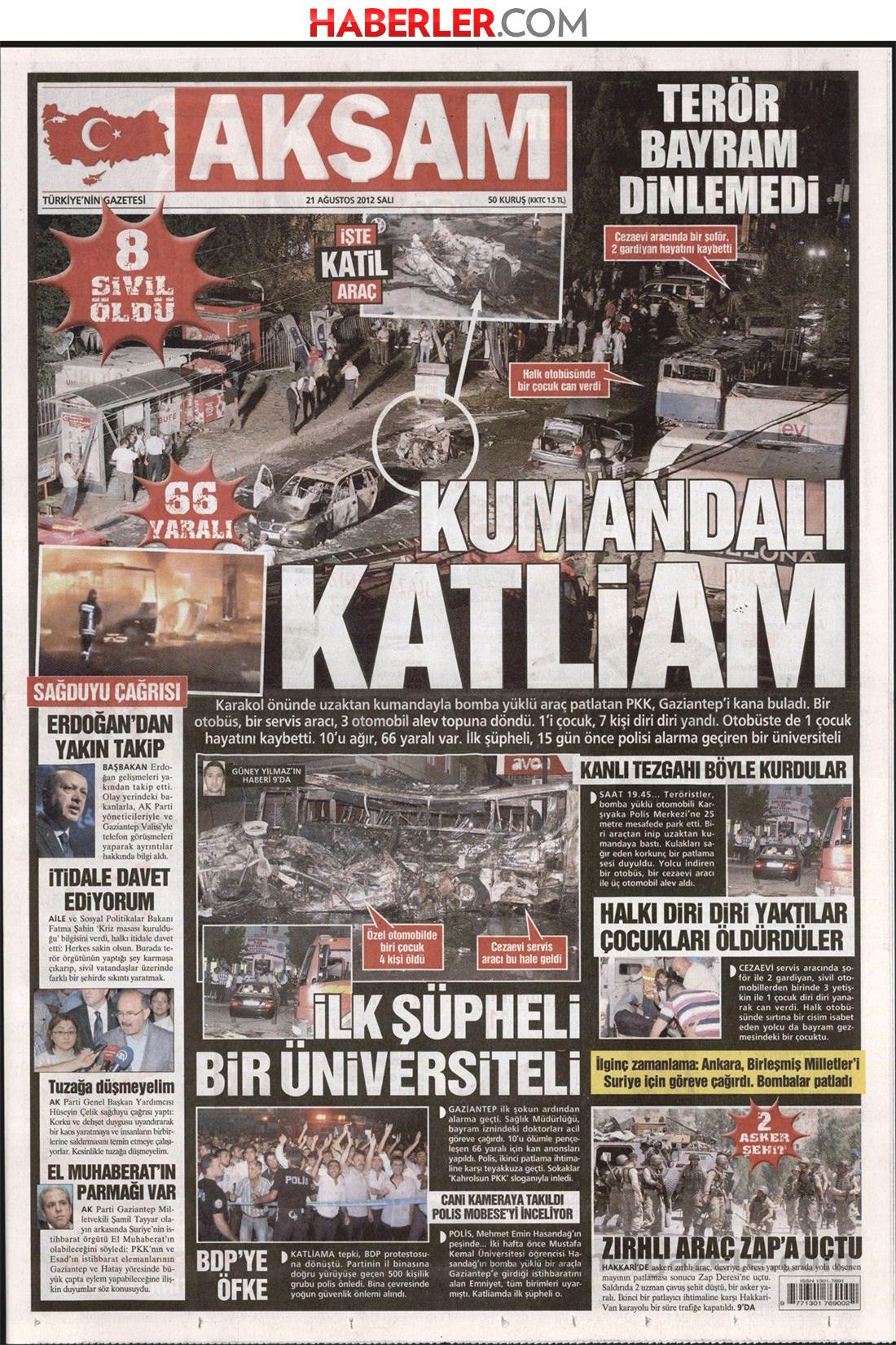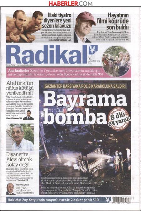 «Βόμβα στο μπαϊράμι» είναι ο τίτλος της Radikal η οποία κάνει αναφορά στην βομβιστική επίθεση στο Γκαζίαντεπ. Η τουρκική εφημερίδα αναφέρει πως η επίθεση πραγματοποιήθηκε με παγιδευμένο φορτηγό όπου σκοτώθηκαν 8 άνθρωποι και τραυματίστηκαν άλλοι 64.