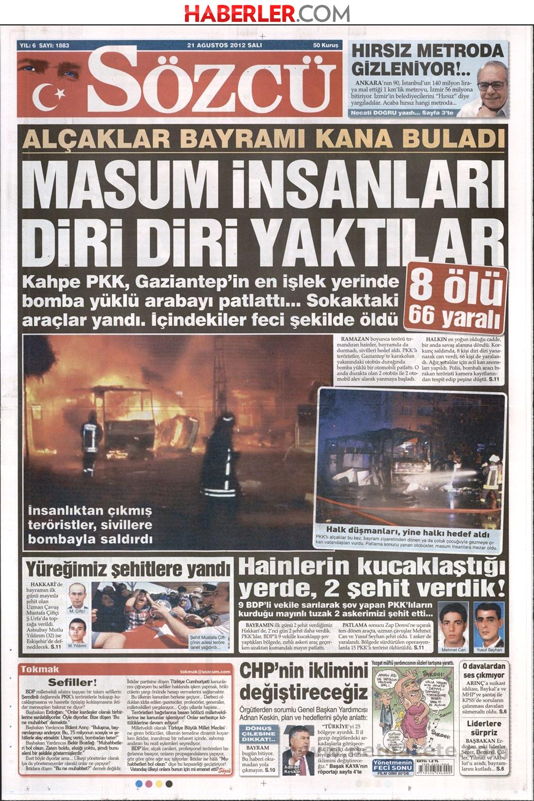« Έκαψαν ζωντανούς αθώους πολίτες» είναι ο τίτλος της Sözcü. H τουρκική εφημερίδα γράφει πως «το PKK ενεργοποίησε εκρηκτικό μηχανισμό στην πιο πολυσύχναστη οδό της πόλης του Γκαζίαντεπ» και αναφέρει ότι τα περισσότερα θύματα είναι αθώοι πολίτες.