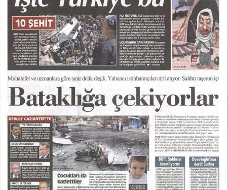 «Ρίχνουν τη χώρα στο βούρκο» είναι ο τίτλος της Cumhuriıyet. H τουρκική εφημερίδα αναφέρεται στα τρομοκρατικά χτυπήματα. « Ειδικοί αναφέρουν πως τα σύνορα είναι τρύπια.Ξένοι πράκτορες αλωνίζουν. Το χτύπημα στο Γκαζίαντεπ είναι δουλειά “υπεργολάβου” γράφει η Cumhuriyet. Σύμφωνα με την εφημερίδα ίσως το χτύπημα να έγινε από την αντιπολίτευση της Συρίας για να προκαλέσει την αντίδραση της Τουρκίας έτσι ώστε να εισβάλλει στη Συρία.