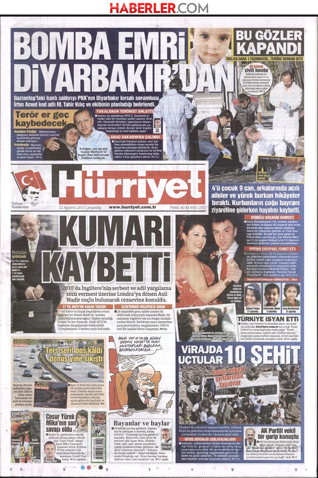 «Έχασε το στοίχημα» είναι ο τίτλος της Ηürriyet. H τουρκική εφημερίδα αναφέρεται στον τουρκοκυπριακής καταγωγής επιχειρηματία Ασίλ Ναντίρ. Ο Ναντίρ ζούσε στην παρανομία επι 17 χρόνια στα Κατεχόμενα για να αποφύγει τις βρετανικές δικαστικές αρχές. «Το 2010 επέστρεψε στο Λονδίνο καθώς του είχαν υποσχεθεί δίκαια δίκη. Όμως καταδικάστηκε για 3 από τα 13 αδικήματα και οδηγήθηκε στη φυλακή. Κάποτε ήταν από τους πλουσιότερους επιχειρηματίες της Μεγάλης Βρετανίας» γράφει η τουρκική εφημερίδα.