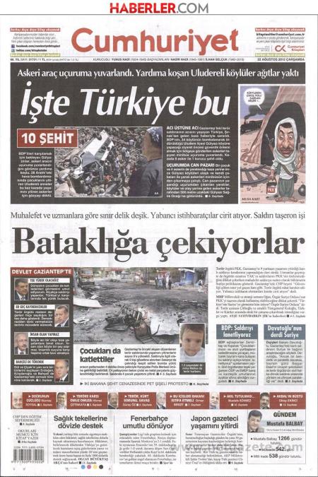 «Ρίχνουν τη χώρα στο βούρκο» είναι ο τίτλος της Cumhuriıyet. H τουρκική εφημερίδα αναφέρεται στα τρομοκρατικά χτυπήματα. « Ειδικοί αναφέρουν πως τα σύνορα είναι τρύπια.Ξένοι πράκτορες αλωνίζουν. Το χτύπημα στο Γκαζίαντεπ είναι δουλειά “υπεργολάβου” γράφει η Cumhuriyet. Σύμφωνα με την εφημερίδα ίσως το χτύπημα να έγινε από την αντιπολίτευση της Συρίας για να προκαλέσει την αντίδραση της Τουρκίας έτσι ώστε να εισβάλλει στη Συρία.
