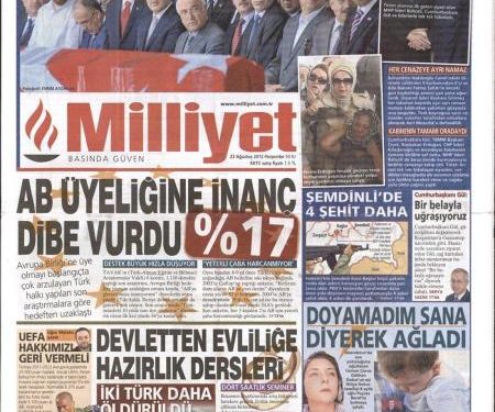 «Κατέρρευσε η πίστη για ένταξη στην Ε.Ε, 17%» είναι ο τίτλος της Milliyet. Η τουρκική εφημερίδα αναφέρει πως σε δημοσκόπηση Γερμανο-τουρκικού κέντρου Ερευνών που πραγματοποιήθηκε σε όλη την Τουρκία μόνο το 17% των Τούρκων πιστεύει πως η χώρα θα ενταχθεί στην Ε.Ε. Σύμφωνα με την έρευνα το 66% των Τούρκων, δεν πιστεύει πως η χώρα θα ενταχθεί στην Ε.Ε. τα επόμενα δέκα χρόνια.