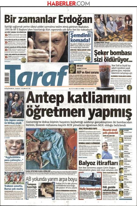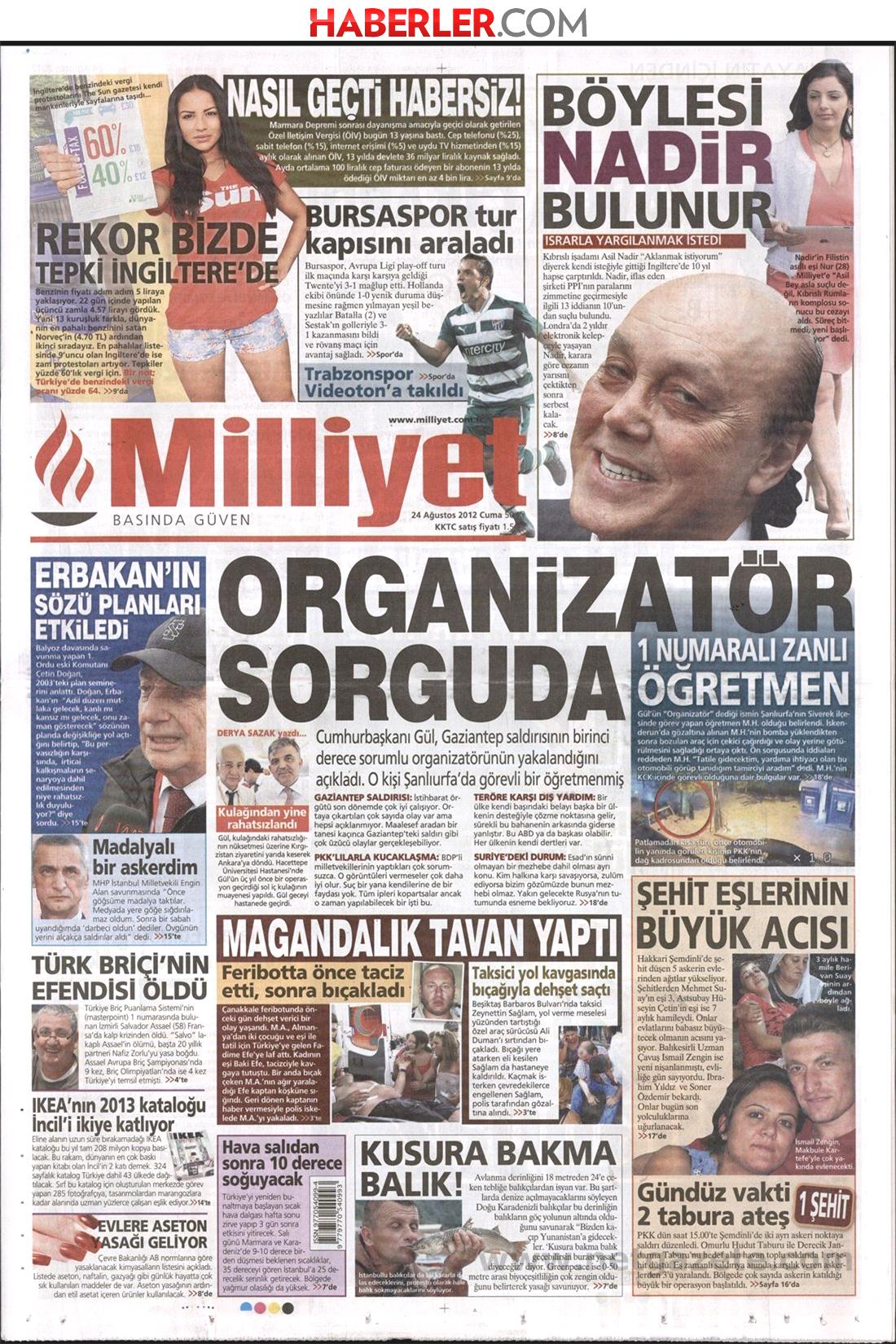 « Ο οργανωτής της επίθεσης ανακρίνεται» είναι ο τίτλος της Milliyet. Η τουρκική εφημερίδα αναφέρει πως ο τούρκος πρόεδρος Αμντουλάχ Γκιούλ, είναι αυτός που αποκάλυψε πως ο οργανωτής της επίθεσης στο Γκαζίαντεπ έχει ήδη συλληφθεί και πως ήταν δάσκαλος.