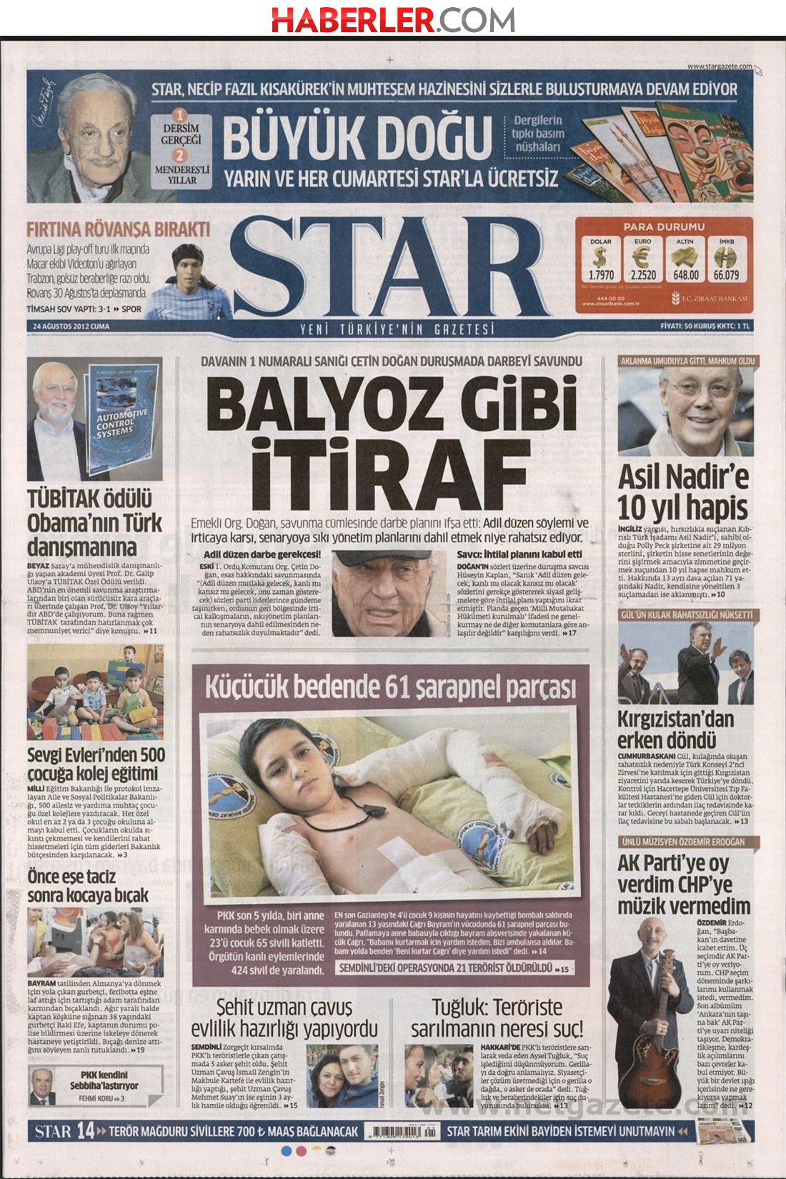 «Ομολογία σαν Βαριοπούλα» είναι ο τίτλος της Star. H τουρκική εφημερίδα αναφέρει πως ο βασικός κατηγορούμενος του σχεδίου συνωμοσίας εναντίον της κυβέρνησης Ερντογάν στρατηγός Τσετίν Ντογάν, «υπερασπίζεται ακόμη και τώρα τη δράση εναντίον της τουρκικής κυβέρνησης»
