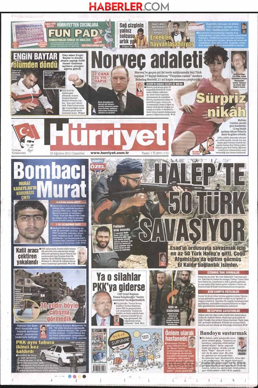 «50 Τούρκοι πολεμούν στο Χαλέπι» είναι ο τίτλος της Habertürk. Η τουρκική εφημερίδα αναφέρει Τούρκοι που οι περισσότεροι έχουν εκπαιδευτεί στο Αφγανιστάν και έχουν διασυνδέσεις με την Αλ Κάιντα , βρίσκονται ήδη στη Συρία και πολεμούν εναντίον του Άσαντ. «Είναι τα ίδια άτομα τα οποία έχουν πολεμήσει στη Βοσνία, σο Τσετσενιστάν και στο Ιράκ» γράφει η Hürriyet..