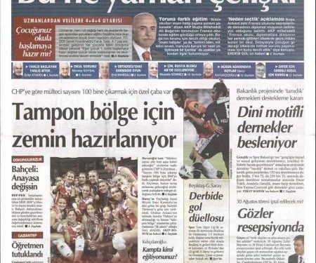 “Ετοιμασίες για ζώνη ασφαλείας» είναι ο τίτλος της Cumhuriyet. H τουρκική εφημερίδα αναφέρει πως στο Ρεπουμπλικανικό Λαϊκό Κόμμα υποστηρίζουν πως η κυβέρνηση Ερντογάν θέλει ο αριθμός των προσφύγων από τη Συρία να αυξηθεί στους 100.000 για να δημιουργηθεί η αφορμή για τη δημιουργία μια ζώνη ασφαλείας στη Βόρεια Συρία και να πιεστούν τα Ηνωμένα Έθνη για μια τέτοια απόφαση.