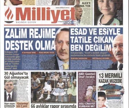 Στην πολεμική που έχει ξεσπάσει ανάμεσα στον Ερντογάν και στον ηγέτη του κόμματος της αξιωματικής αντιπολίτευσης αναφέρεται η Milliyet. « Μην στηρίζεις το βάρβαρο καθεστώς» είναι ο ένας τίτλος της τουρκικής εφημερίδας που αναφέρεται στις κατηγορίες του Ερντογάν εναντίον του Κιλιτσντάργολου καθώς υποστηρίζει πως τον Άσαντ. Ενώ ο Κιλιστάρογλου δηλώνει « δεν είμαι εγώ αυτό ς που έχει πάει διακοπές με την οικογένεια Άσαντ»