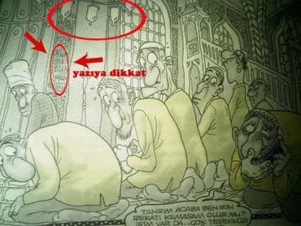 Η γελοιογραφία,που δημοσιεύτηκε στο περιοδικό «Penguen», στο άνω δεξιό μέρος και εντός του κόκκινου κύκλου αναγράφεει «Δεν υπάρχει Θεός». Κάτω αριστερά φαίνεται ένας πιστός να μιλά στο κινητό του τηλέφωνο. Μιλάει με τον Θεό και του λέει «Μήπως είναι δυνατόν να μην ολοκληρώσω το τελευταίο τμήμα της προσευχής μου διότι έχω κάποια επείγουσα εργασία; Ευχαριστώ πολύ». Προφανώς, ο Θεός του έδωσε την άδεια να αποχωρήσει. Αμέσως μετά τη δημοσίευση, ασκήθηκε εισαγγελική δίωξη εναντίον του σκιτσογράφου για προσβολή του Ισλάμ.