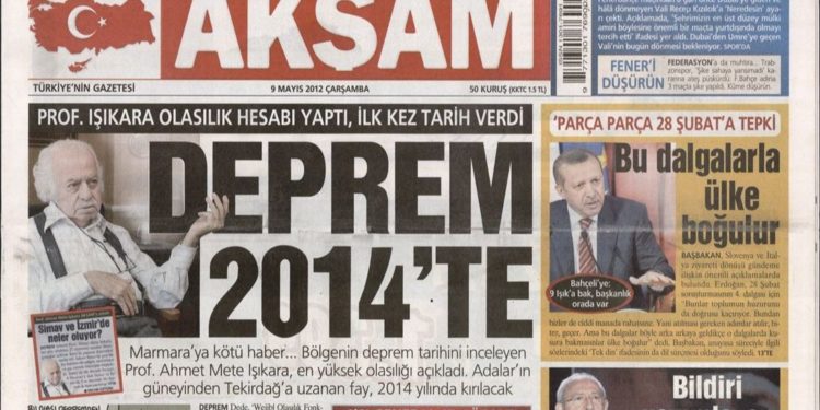 “O σεισμός το 2014» είναι ο τίτλος  της τουρκικής εφημερίδας Akşam  που αναφέρεται σε δηλώσεις του διάσημου τούρκου σεισμολόγου Αχμέτ Μετέ Ισίκαρα.