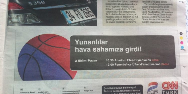 «Oι Έλληνες εισέβαλαν στον εναέριο μας χώρο». Με αυτόν τον πονηρό τρόπο διαφήμισε το τηλεοπτικό δίκτυο CNN Turk τη μετάδοση των αγώνων μπάσκετ ανάμεσα στον Ολυμπιακό με την Αναντολού Έφες και του Παναθηναϊκού με την Φενέρμπαχτε Ούλκερ.